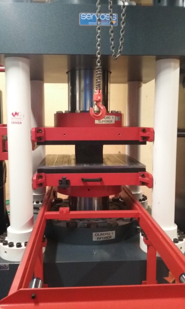 The ME 408 elastomeric bearing testing machine from SERVOSIS is a monoblock servo-hydraulic drive system specifically designed to conduct tests according to the UNE-EN 1337-3 standard. It performs shear modulus, shear bond, and compression tests, respectively.